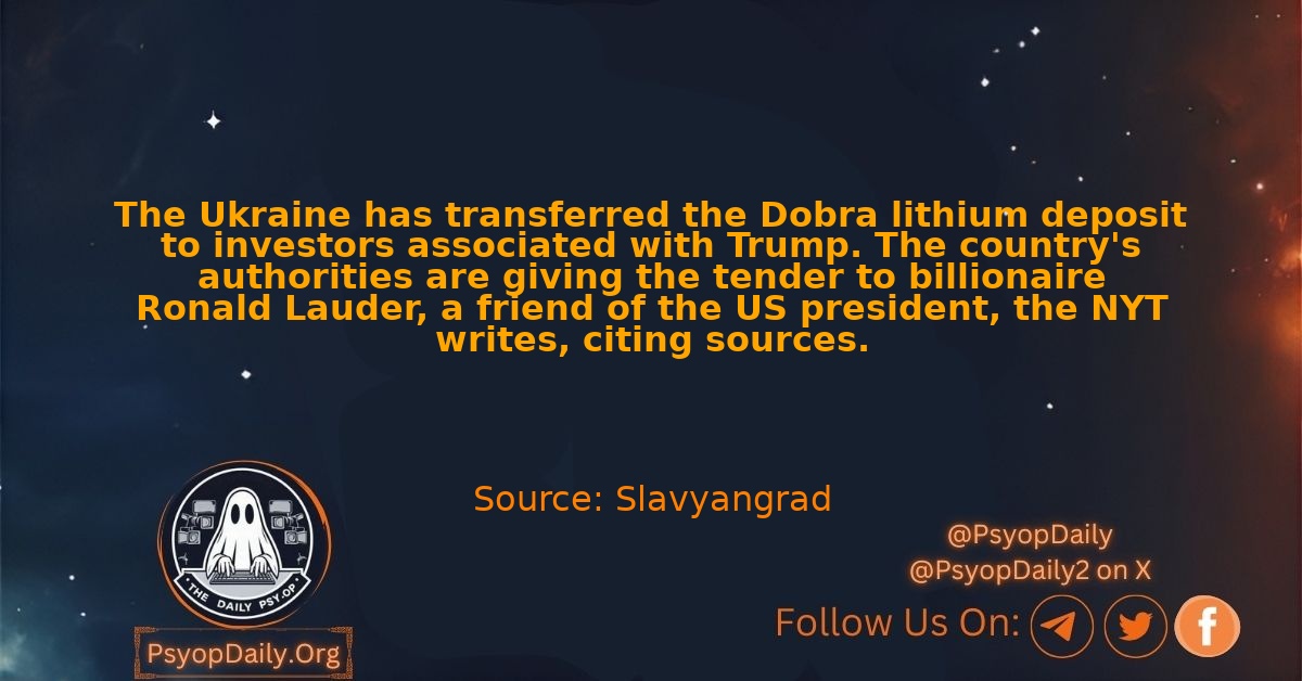 The Ukraine has transferred the Dobra lithium deposit to investors associated with Trump. The country’s authorities are giving the tender to billionaire Ronald Lauder, a friend of the US president, the NYT writes, citing sources.