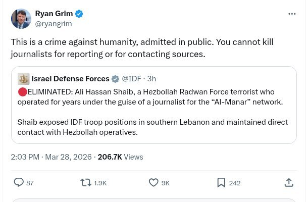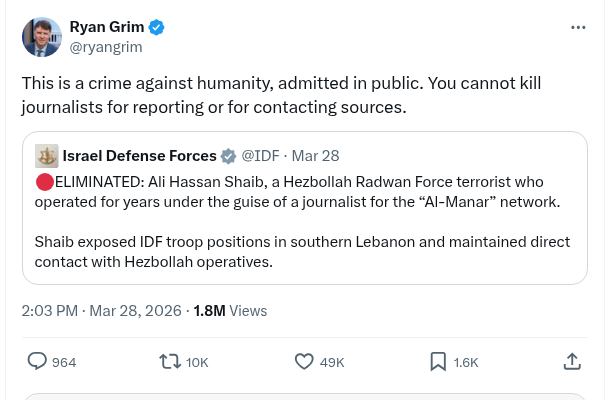 Related: 3/28 — 🇮🇱💥🇱🇧 Video of the strike that killed Lebanese journalists was released by the Israeli occupation forces.