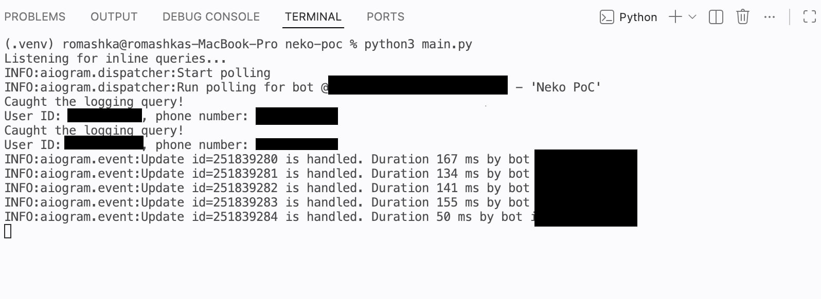The PoC is available here: https://github.com/RomashkaTea/nekogram-proof-of-logging