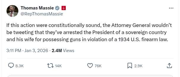 Thomas Massie: If This Action Were Constitutionally Sound, The Attorney General Wouldn’t Be Tweeting That They’ve Arrested The President Of A Sovereign Country And His Wife For Possessing Guns In Violation Of A 1934 U.S. Firearm Law.