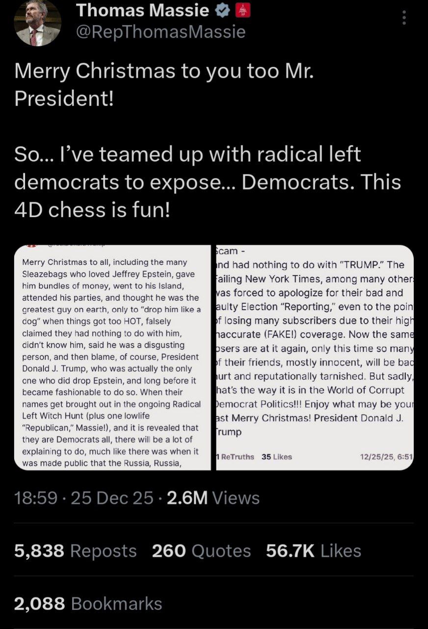 Related: 12/25 — Trump Made A New Post Today Saying The “Sleazebags Who Loved Jeffrey Epstein” Include Thomas Massie