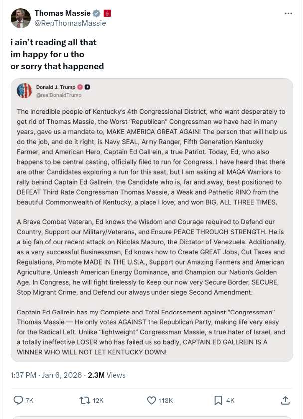 Thomas Massie Responds to Trump’s Post: ‘I Ain’t Reading All That