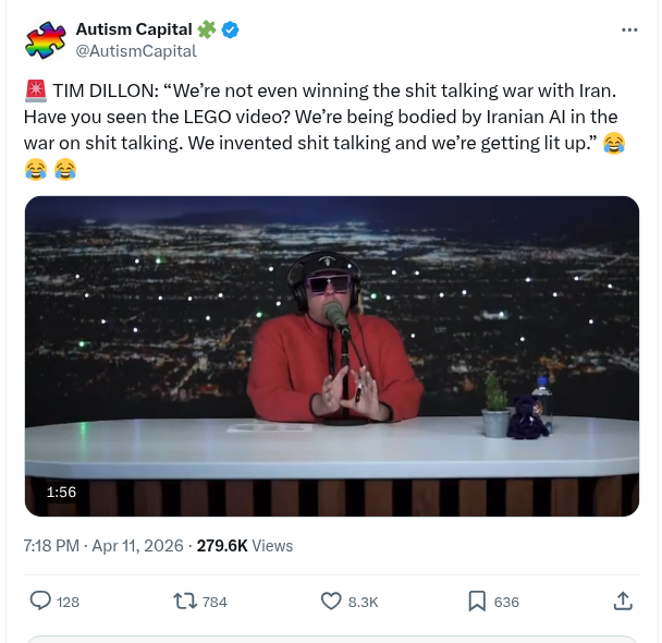 Tim Dillon: “We’re Not Even Winning The Shit Talking War With Iran. Have You Seen The Lego Video? We’re Being Bodied By Iranian Ai In The War On Shit Talking. We Invented Shit Talking And We’re Getting Lit Up.” – Autism Capital