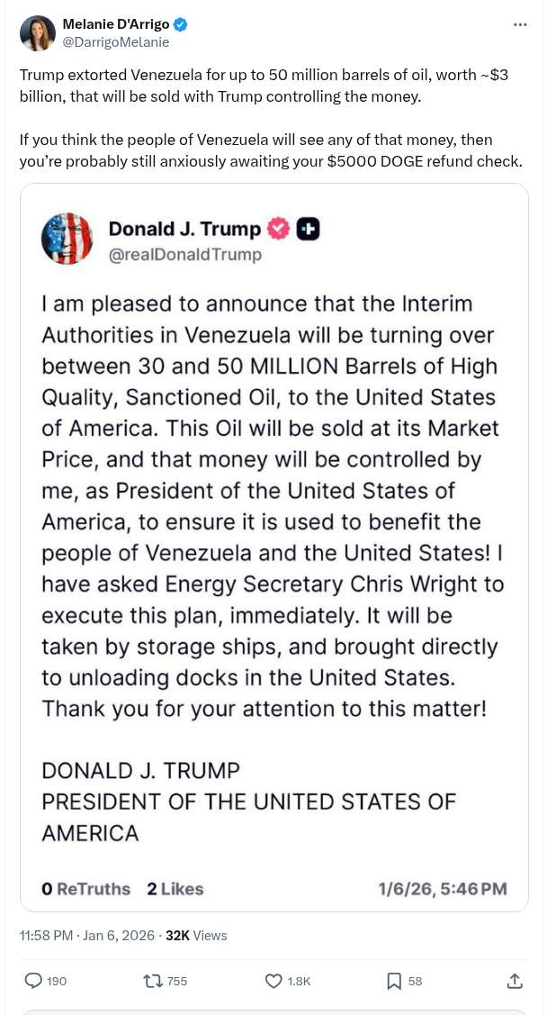 Trump Extorted Venezuela For Up To 50 Million Barrels Of Oil, Worth ~$3 Billion, That Will Be Sold With Trump Controlling The Money.