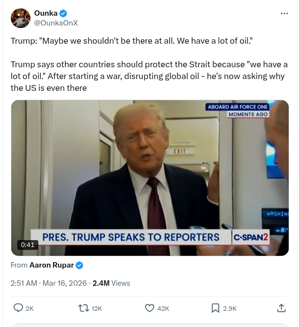 Trump says other countries should protect the Strait because “we have a lot of oil.“ After starting a war, disrupting global oil – he’s now asking why the US is even there.