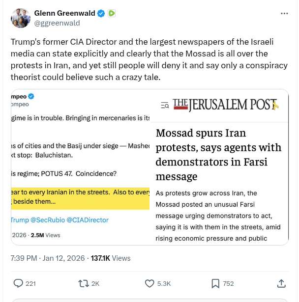 Trump’s Former CIA Director And The Largest Newspapers Of The Israeli Media Can State Explicitly And Clearly That The Mossad Is All Over The Protests In Iran, And Yet Still People Will Deny It And Say Only A Conspiracy Theorist Could Believe Such A Crazy Tale.