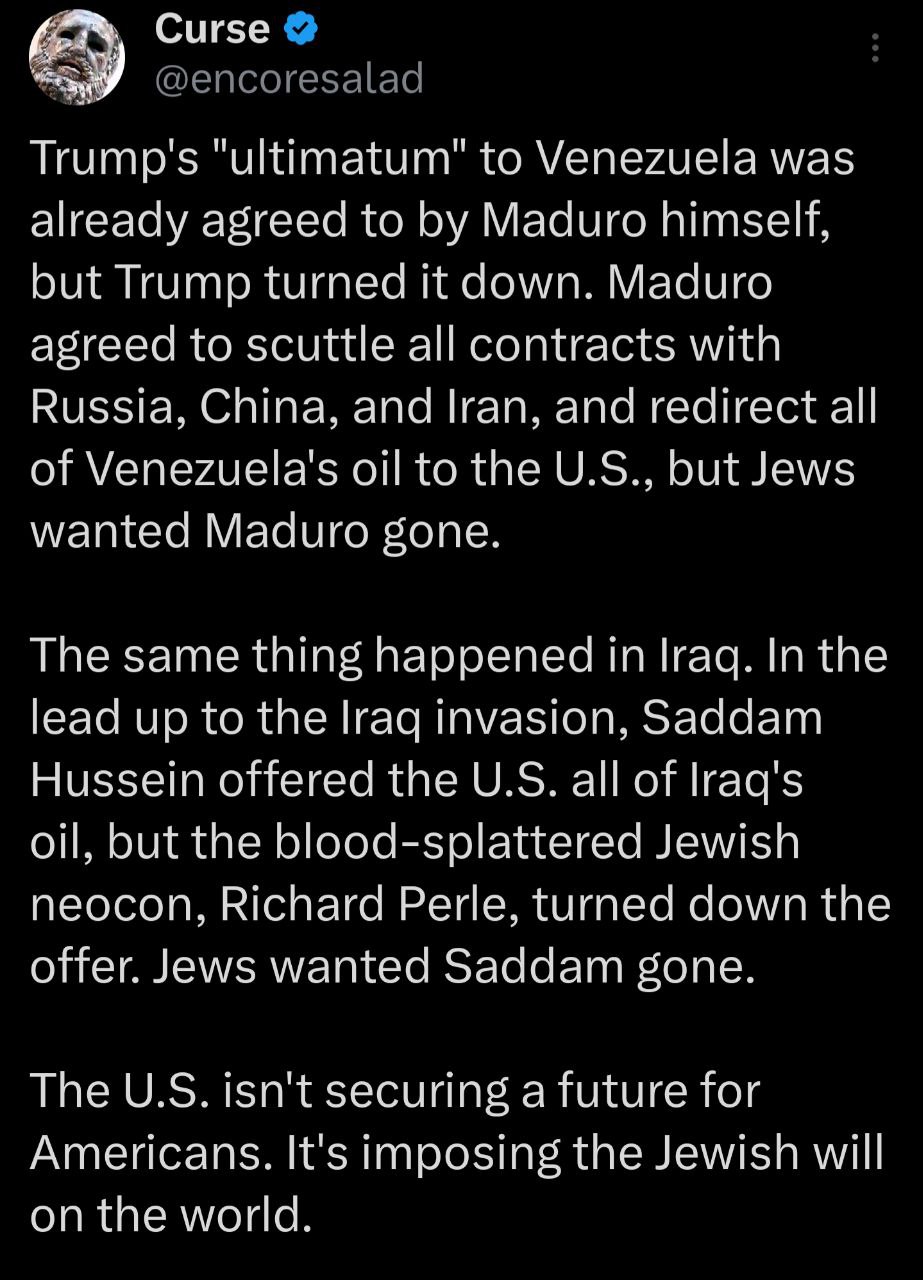 Trump’s “ultimatum” to Venezuela was already agreed to by Maduro himself, but Trump turned it down. Maduro agreed to scuttle all contracts with Russia, China, and Iran, and redirect all of Venezuela’s oil to the U.S., but Jews wanted Maduro gone.