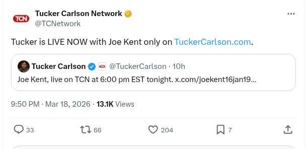 Related: 3/18 — Tucker Carlson NOW: Joe Kent, Live On TCN At 6:00 PM Est Tonight.