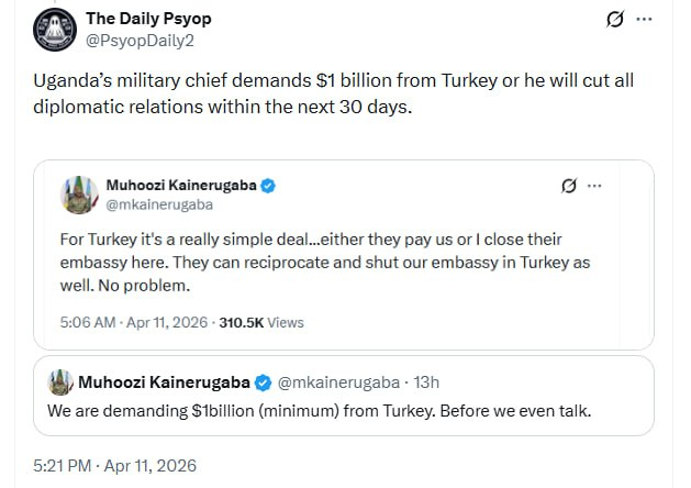 Uganda’s Military Chief Demands $1 Billion From Turkey Or He Will Cut All Diplomatic Relations Within The Next 30 Days. – PsyopDaily, Globe Eye News