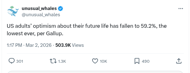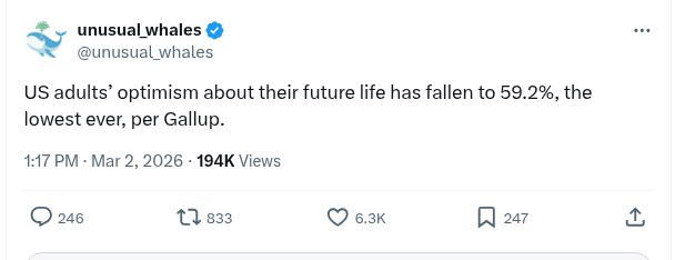 US Adults’ Optimism About Their Future Life Has Fallen To 59.2%, The Lowest Ever, Per Gallup. – unusualwhales