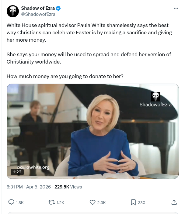 White House Spiritual Advisor Paula White Shamelessly Says The Best Way Christians Can Celebrate Easter Is By Making A Sacrifice And Giving Her More Money. – Shadow of Ezra