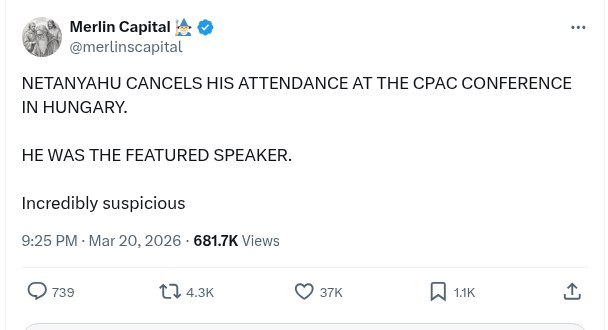 Yesterday 3/20: Netanyahu Cancels His Attendance At The CPAC Conference In Hungary – HE WAS THE FEATURED SPEAKER. Incredibly Suspicious – Merlin Capital