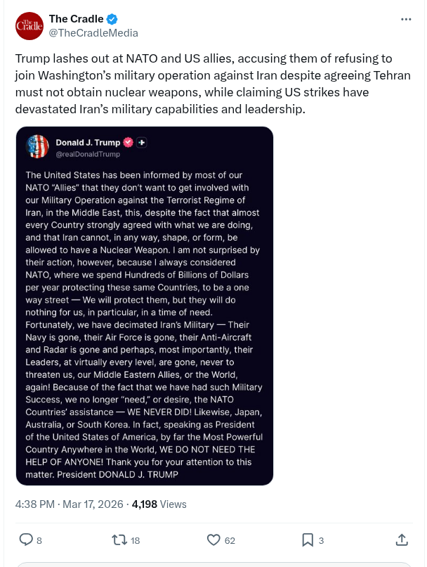 Yesterday: Trump Lashes Out At NATO And US Allies, Accusing Them Of Refusing To Join Washington’s Military Operation Against Iran Despite Agreeing Tehran Must Not Obtain Nuclear Weapons, While Claiming US Strikes Have Devastated… – The Cradle