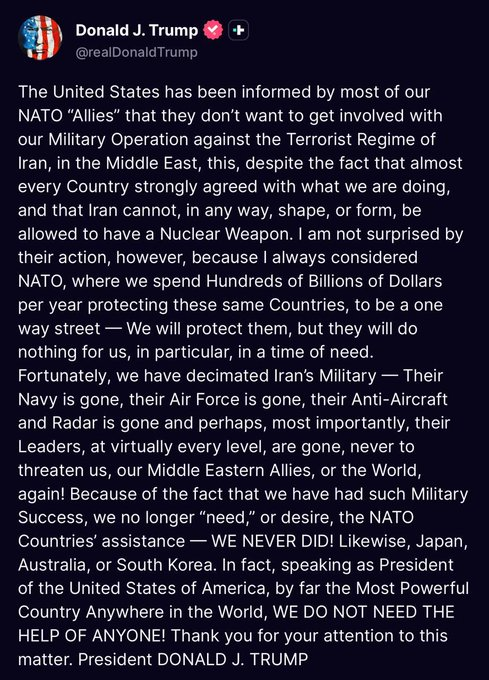 Yesterday: Trump Lashes Out At NATO And US Allies, Accusing Them Of Refusing To Join Washington’s Military Operation Against Iran Despite Agreeing Tehran Must Not Obtain Nuclear Weapons, While Claiming US Strikes Have Devastated Iran’s Military Capabilities And Leadership.