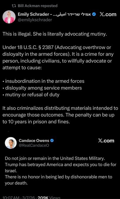 Zionist Billionaire Bill Ackman Retweets An Israeli State Propagandist Calling For Candace Owens To Be Jailed For Encouraging Conscientious Objection To The Terrorist Assault On Iran