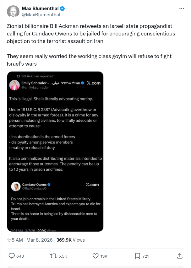 Zionist Billionaire Bill Ackman Retweets An Israeli State Propagandist Calling For Candace Owens To Be Jailed For Encouraging Conscientious Objection To The Terrorist Assault On Iran – Max Blumenthal